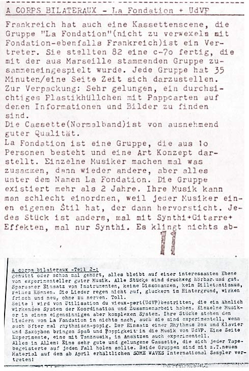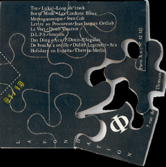 | A Corps Bilatéraux En 1982 La Fondation s'associe au collectif marseillais Utilisation Du Vieux Port pour réaliser A Corps Bilatéraux, une cassette tirée à 500 exemplaires, dont chaque face est réalisée par chacune des entités respectives. Un morceau - Paris Marseille - est collectivement composé via des échanges de bandes magnétiques donnant au mail-art une nouvelle dimension... La cassette accompagnée d'un jeu de 15 cartes illustrées est présentée dans une pochette de plastique translucide. |